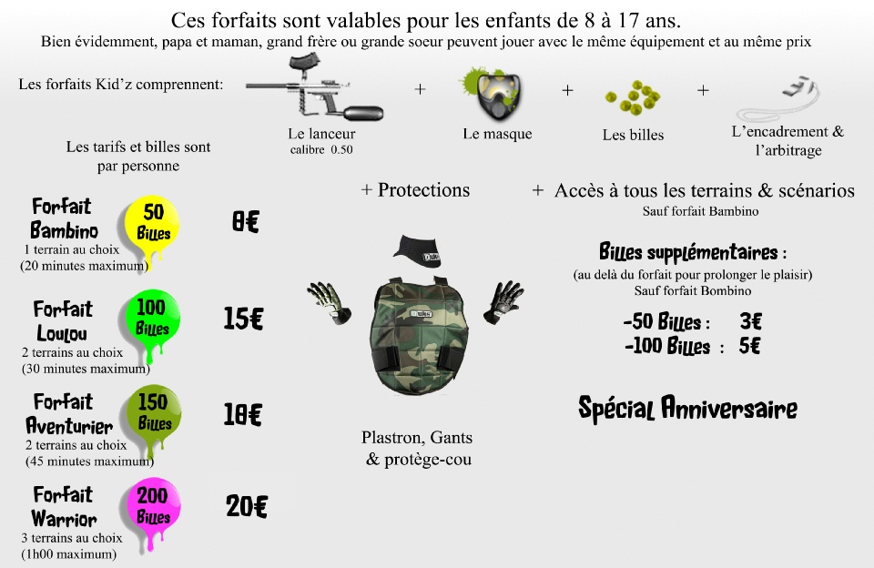 Plusieurs forfaits vous sont proposés, la seule différence est tout simplement la quantité de billes que l’on vous donne (par personne) avec le matériel. Pour le reste, c’est: